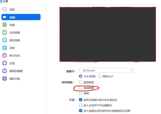 6.进入考场:考生进入考场后,需对ZOOM作视频设置,如下图1所示:点击视频设置,点选视频,在红圈处取消视频镜像,解除静音,开启视频,然后请听从考官指令完成有关操作。