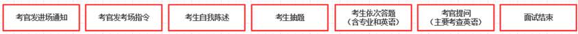 7.测试过程:考生打开副机位视频,然后听从考官指令,拿起副机位设备站立将摄像头对外缓缓环绕 360o,接受考官对考场环境检查(注:在复试过程中,考官有权利酌情对考生的考试环境进行再次检查)。检查完成,考生需将对应设备放置回初始位置。考生在主机位前入坐,根据考官指令完成相关操作、自我陈述、抽题回答(含专业和英语)、考官提问(主要考查英语能力)等环节(如下图2所示)。面试结束后,考生需及时退出两套会议系统,以免影响到下一位考生的考试。