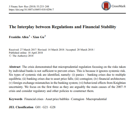 The crisis demonstrated that microprudential regulation focusing on the risks taken by individual banks is not sufficient to prevent crises. This is because it ignores systemic risk. Six types of systemic risk are identified, namely: (i) panics – banking crises due to multiple equilibria; (ii) banking crises due to asset price falls; (iii) contagion; (iv) financial architecture; (v) foreign exchange mismatches in the banking system; (vi) behavioral effects from Knightian uncertainty. We focus on the first three as they are arguably the main causes of the 2007–9 crisis and consider regulatory and other policies to counteract them.
