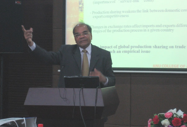 12 月 18 日 下午, 应公司与公司国际金融研究中心之邀, 澳大利亚国立大学亚太研究院经济系教授、澳大利亚社会科公司研究员 Prema-chandra Athukorala 来公司做了题为 “ Global Production Sharing and the Measurement of Price Elasticities in International Trade ”的学术报告。本次讲座是公司“经济与金融学名家论坛 ”系列讲座的第三十二期,由公司经理、公司国际金融研究中心主任张礼卿教授主持。