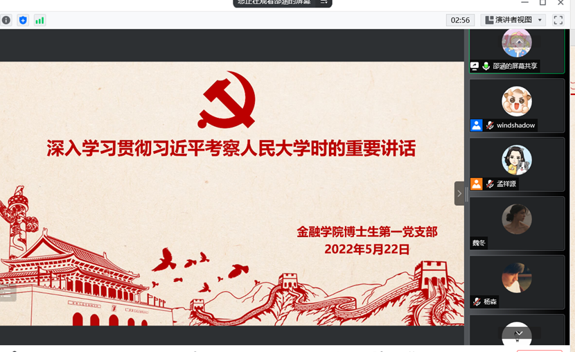 为深入学习贯彻习近平总书记在视察人民大学时的重要讲话、习近平总书记在庆祝共青团成立一百周年的重要讲话精神。博士生第一党支部于2022年5月22日晚上7点半召开主题党日学习活动。32名党员参加学习,会议由支部书记赵志桦同志主持,党支部入党积极分子王瑶列席会议。