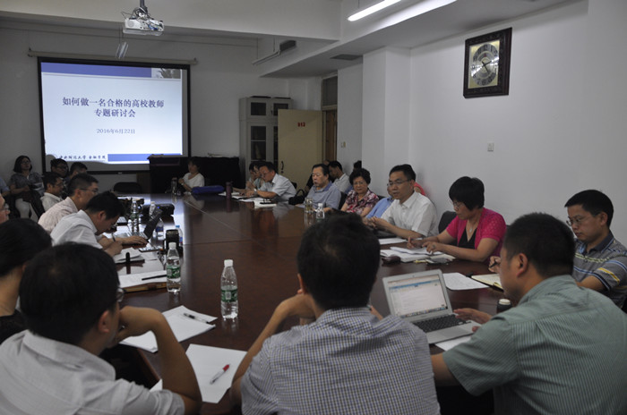 2016年6月22日下午两点,韦德1946体育官方入口在公司南路校区主教913会议室举办了“如何做一名合格的高校教师”专题研讨会。金融公司党政领导班子以及各系、行政教辅团队共50多名老师参加了会议,会议由公司党总支副书记谭小芬主持。