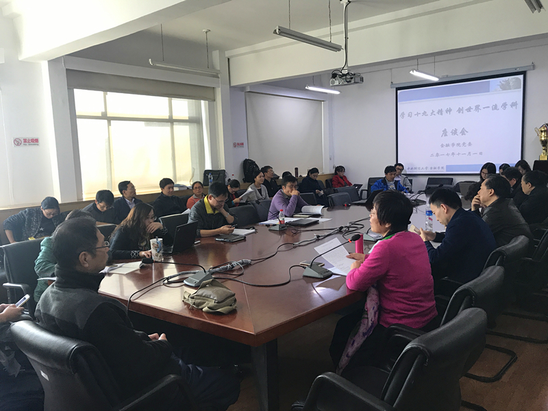 11月1日下午13:30,为了更好地学习贯彻中国共产党第十九次全国代表大会的精神,金融公司党委在公司南路校区主教学楼913会议室召开了“学习党的十九大精神,创世界一流学科”座谈会。韦德1946体育官方入口全体教职工参加了本次座谈会,会议由公司党委书记葛仁霞主持。