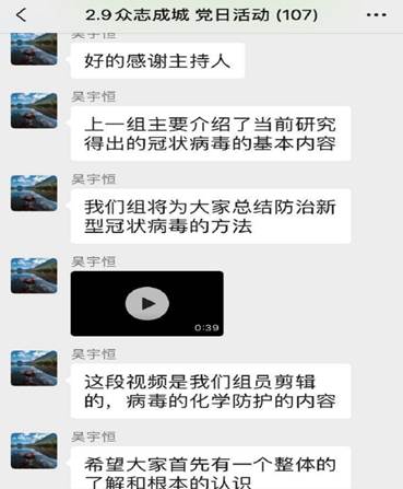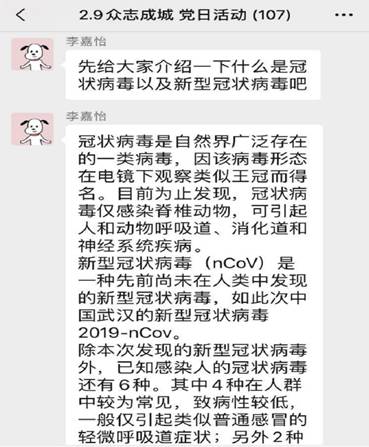 第一小组围绕主题“新型冠状病毒的介绍”展开学习,在学习讨论过程中,小组从什么是冠状病毒出发,学习了其临床表现,并针对“何为密切接触者”展开了详细的了解。在学习讨论过程中,小组成员不仅就疫情展开了交流,还围绕“作为一名党员,如何在疫情防控、以及疫情防控期间做好教学准备等工作中发挥党员先锋模范作用”开展线上讨论,学习奋斗在一线的战士们如何发挥党员“在一切困难和危险的时刻挺身而出,英勇斗争,不怕牺牲”的精神,坚定信心,共克时艰,坚决配合国家、公司打赢这场疫情防控阻击战。