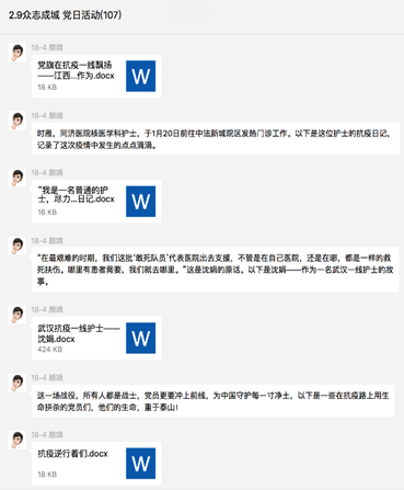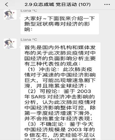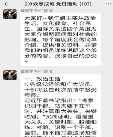 本次党日活动采取线上交流的方式进行。在分享之前,支部成员分为了五组,分别从新型冠状病毒的介绍、如何防治新型冠状病毒、新型冠状病毒对经济的影响、新型冠状病毒对社会的影响、抗疫过程中的先进党员事迹五个角度进行学习。线上交流时间为2月9日下午14:00到17:00,共计3个小时。交流过程由分享、回答、总结三个环节构成。本次分享材料形式多样,从文字到视频,体现了小组成员的精心准备。交流过程中维持着良好的秩序,同时又能看到思想碰撞的火花。