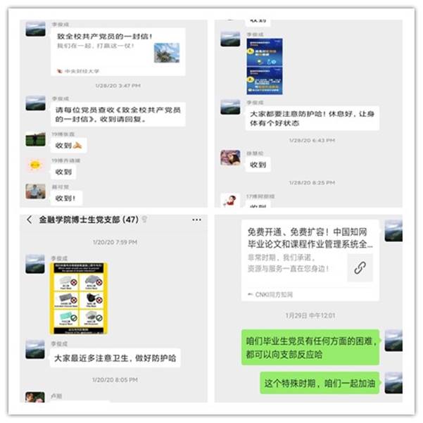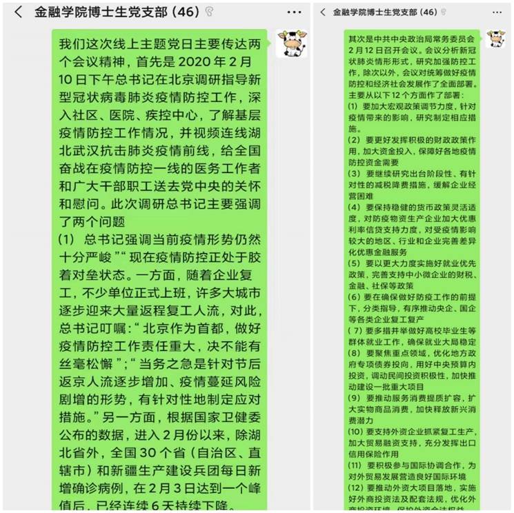 除此次主题党日活动以外,韦德1946体育官方入口博士生党支部也积极响应公司公司党委号召,从公司党委指示传达、疫情防控措施宣传以及稳定党员情绪等多个方面同时展开行动,切实发挥党支部基层战斗堡垒作用。如(1)向党支部全体成员传达了金融公司党委《致全校共产党员的一封信》,支部党员同志积极响应。(2)向支部成员传达防护知识,坚决要求党员同志做到“不造谣、不传谣、不信谣”,以身作则,引导身边亲朋辨别网络信息,传播正能量(3)建立了应届毕业党员的微信群,了解了毕业生党员在毕业论文、求职等方面的进展,向毕业生党员介绍了公司VPN账户的使用方法,转发了中国知网免费扩容的链接。