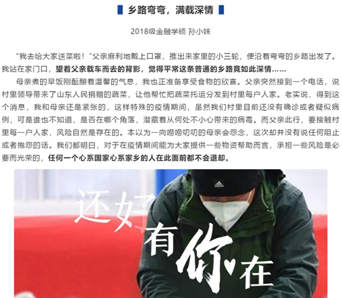 为响应公司讲述好“舍小家、顾大家、为国家”的感人故事,凝聚起众志成城、齐心抗疫的强大力量的号召,进一步鼓舞全体师生的抗“疫”斗志,坚定抗“疫”信心,韦德1946体育官方入口举办“见字如面,合力抗疫”征文活动,本支部党员、积极分子积极参与、踊跃投稿,其中孙小妹同志的作品《乡路弯弯,满载深情》入选。简单的词句中饱含着对湖北一线抗“疫”人员的感激和敬佩,也展示了对此次战“疫”必胜的坚定信心。