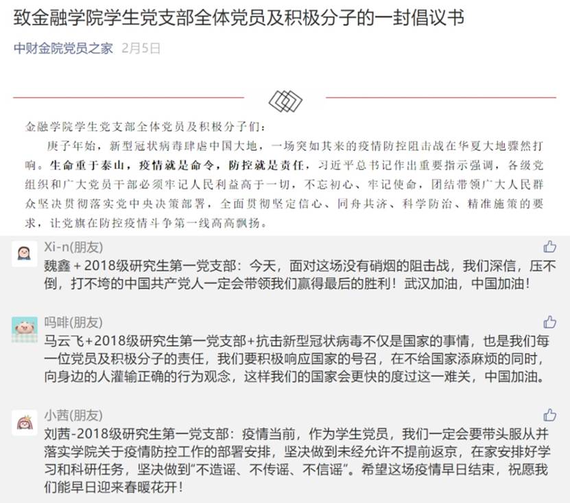 1月28日,公司党委发出了《致全校共产党员的一封信》,号召全公司党员弘扬“担当责任、勇往直前”的中财精神,充分发挥共产党员的先锋模范作用,坚决打赢这场疫情防控阻击战。作为2018级研究生第一党支部书记的阮志朋同志第一时间转发,呼吁本支部党员同志提高政治站位,遵从党委统一部署,充分发挥研究生基层党组织战斗堡垒作用;强化政治担当,协助公司积极引导,充分发挥党员干部示范带头作用;增强政治自觉,严控自身行为作风,带头做命令的执行者、稳定的维护者。2月5日,公司党委发出了《致韦德1946体育官方入口员工党支部全体党员及积极分子的一封倡议书》,号召全体党员及积极分子带头服从并落实公司关于疫情防控工作的部署安排,坚决做到在特殊时期不离家、不提前返校。本支部的党员同志和积极分子纷纷在微信公众号下留言承诺:“我将以身作则,少出门,少聚会,勤洗手,不传谣信谣,以实际行动发扬党员的模范带头作用”、“我们一定会带头服从并落实公司关于疫情防控工作的部署安排,坚决做到未经允许不提前返京,在家安排好学习和科研任务”……一句句承诺饱含着党员同志众志成城、共克时艰的决心与信心。