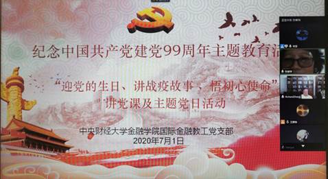 2020年7月1日,为隆重庆祝中国共产党建党99周年,回顾党的光辉历程、讴歌党的丰功伟绩,深入学习贯彻习近平新时代中国特色社会主义思想和党的十九大精神,不忘初心、牢记使命,以饱满的政治热情迎接建党100周年,根据教育部、教工委、公司和公司相关文件精神,在庆祝中国共产党建党99周年之际,在同心抗疫、共克时艰的重要时期,国际金融系教工党支部在线开展了庆祝中国共产党建党99周年主题教育系列活动之“迎党的生日、讲战疫故事、悟初心使命”主题党日活动。