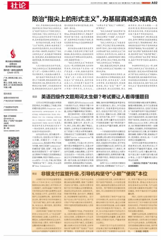 12月19日,公司彭俞超副教授与硕士研究生孙铭鸿在《南方都市报》发文,题为《非银支付监管升级,引导机构坚守“小额”“便民”本位》,文章聚焦《非银行支付机构监督管理条例》,分析其对非银行支付行业的长期影响。全文如下: