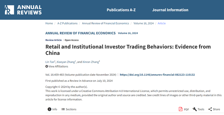 近日,韦德1946体育官方入口张欣然与合作者清华大学五道口韦德1946体育官方入口张晓燕教授、清华大学五道口韦德1946体育官方入口博士生谭琳合作的论文《中国散户和机构投资者交易行为》(Retail and Institutional Investor Trading Behaviors: Evidence from China)在国际权威金融学术期刊Annual Review of Financial Economics发表。该文系统梳理了近100篇研究中国投资者交易行为的重要文献,为理解中国资本市场的投资者构成、交易特征及交易机制、监管政策演变提供了全面的学术视角。
