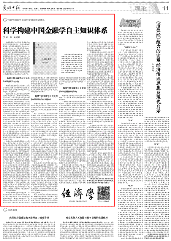 99日,《光明日报》理论版刊发公司李健教授以及副董事长李建军教授题为《科学构建中国金融学自主知识体系》的署名文章。文章阐述了构建中国金融学自主知识体系的四梁八柱,包括其必要性、科学方法论、理论与实践基石以及创新理论架构。