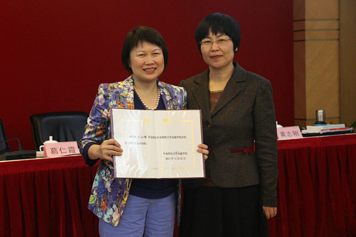 葛仁霞书记向光大银行海口分行副行长尤小嵘颁发业界导师聘书