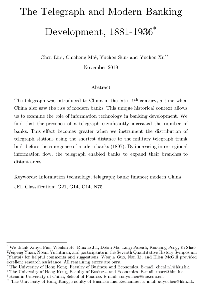 一、主题:The Telegraph and Modern Banking Development, 1881-1936