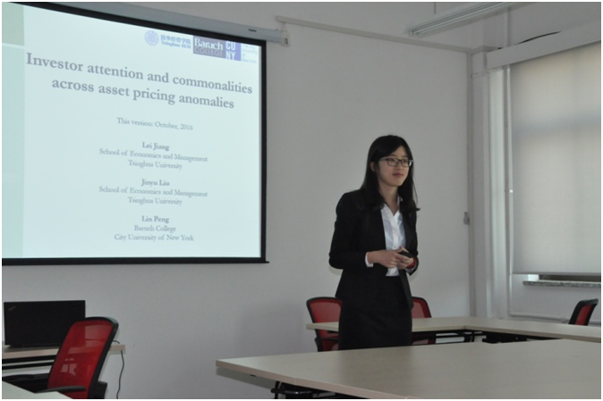 本次研讨会由清华大学经济与管理公司金融系博士生刘津宇就“投资者关注与股票市场异象”做了专业而精彩的报告。研究以2008年—2015年所有A股上市公司为样本,使用Double-Sort的方法,利用股吧论坛中每日的发贴数量来衡量股票关注度,研究投资者注意力强度不同的股票其异象收益的差异,研究发现投资者关注度可以解释股票市场中大部分的异象。对于投资者关注度较高的股票,其在交易中存在着大量的噪声交易者,这使得套利行为难以进行,从而价格难以回归理性。对于参会老师所提出的为何使用中国数据的问题,刘津宇博士解释,在中国由于个人投资者占有相当重要的地位,因此更容易构建投资者关注度这一指标,同时由于中国所特有的涨跌停制度,可以使研究者利用股票价格四舍五入这一外生因素区分投资者注意力差异,从而使得研究结果更为稳健。在报告会中,参会老师与演讲嘉宾就报告内容展开了热烈的讨论,提出许多富有启发性的意见和建议,使得各参会人员受益良多。