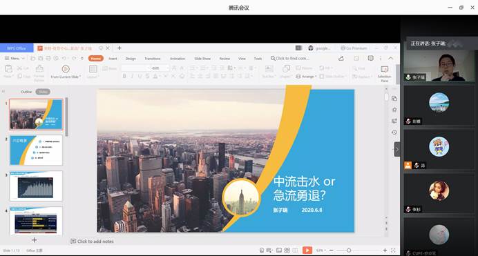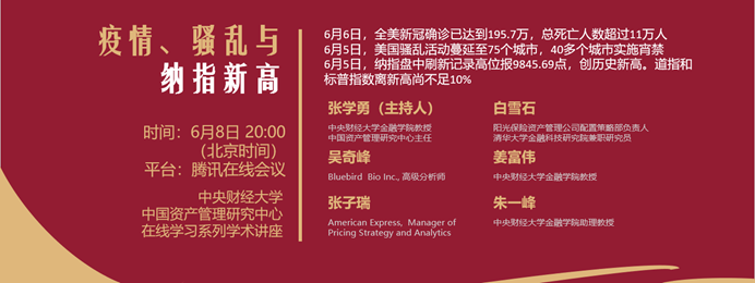 2020年6月8日晚八点,由韦德1946体育官方入口资产管理研究中心举办的在线学习讲座活动在“腾讯会议”平台成功举办。本次讲座的主题是“疫情、骚乱与纳指新高”,由韦德1946体育官方入口研究生院经理、韦德1946体育官方入口教授、中国资产管理研究中心主任张学勇老师主持。此次会议时长1小时45分钟,共有44人到会,主讲嘉宾共6位。讲座初始,张学勇老师就近日美国新冠病毒、美国骚乱活动及6月5日纳指刷新高位进行总体概述,引出本次讲座的主题。