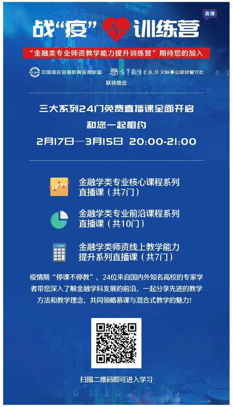 由2018-2022年教育部高等公司金融类专业教学指导委员会作为指导单位,教指委秘书处机构韦德1946体育官方入口,联合中国高校金融教育“金课”联盟、高等教育出版社和爱课程中国大学MOOC平台,在抗“疫”期间,积极贯彻落实教育部《关于在疫情防控期间做好普通高等公司在线教学组织与管理工作的指导意见》的精神,组织策划并深入开展了全国高校“金融类专业骨干团队教学提升训练营”项目。该项目邀请了国内外高校金融类专业领域教学经验丰富的教学名师、知名专家学者、中国大学MOOC上线课程主持人,分三期推出了24门次专业直播课程,深入讲解学科前沿和内涵,提供基于线上课程的教学方法指导,帮助高校金融类专业教师快速有效地开展线上教学。训练营全程通过中国大学MOOC平台直播,由网易提供技术支持。