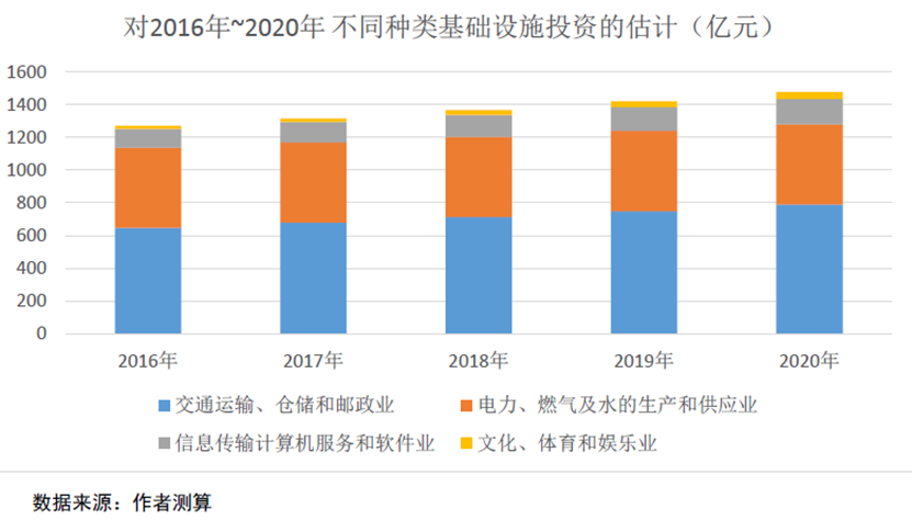 本文参考Fay(2001)的方法,从需求层面出发,通过对消费者和生产者的需求分析,估计基础设施投资的需求规模。使用2005年~2013年我国各省人均分行业固定资产投资投资数据替代人均基础设施需求变量,并用我国各省人均GDP、第一产业和第二产业占生产总值比率进行回归。从打造丝绸之路核心区出发,即建设交通枢纽、商贸物流及文化科教中心所需要的基础设施服务,本文对交通运输、仓储和邮政业;电力、燃气及水的生产和供应业;信息传输计算机服务和软件业以及文化、体育和娱乐业五个方面的全社会固定资产投资分别进行回归。并且根据回归系数,带入对未来五年人均GDP及人口增长的预测,同时假设第一产业和第二产业占GDP份额保持不变,对2016年~2020年基础设施建设投资规模预测结果见下图。其中可以看到,道路类基础设施建设仍是未来五年基础设施建设的重头戏。根据预测结果可得,未来五年此四类基础设施建设投资总计需约6855.4685亿元。