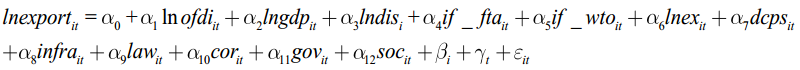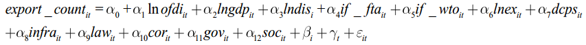 其中第一个扩展的引力模型用于分析中国对一带一路国家的直接投资对贸易深度边际(出口总量)的影响。第二个扩展的引力模型用于分析中国对一带一路国家的直接投资对贸易广度边际(出口产品种类数量)的影响。