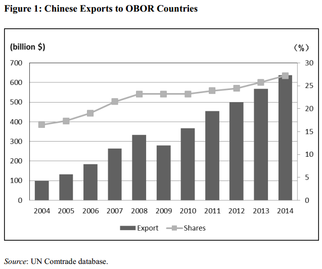 中国的“丝绸之路经济带”和“海上丝绸之路”战略举措涉及64个国家和地区。图1显示了中国与一带一路国家的贸易情况:中国对一带一路国家的出口从2004年的980.55亿美元增加到2014年的6369.6亿美元,在中国出口总额中所占的比重从2004年的16.52%上升到2014年的27.22%。表明中国与一带一路国家之间的贸易联系日益加深(见图1)。