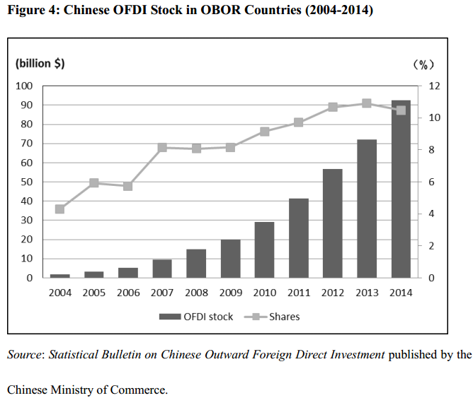 图4显示了中国对一带一路国家的直接投资情况:中国对一带一路国家直接投资总额从2004年的19.32亿美元增长到2014年的924.2亿美元,增长了47倍多。中国对“一带一路”国家的投资占中国投资总额的比例也从2004年的4.31%上升到2014年的10.47%。表明过去十年中国在“一带一路”国家的OFDI一直稳定增长(见图4)。