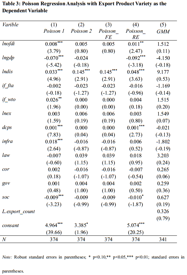 本文的贡献在于:首先,我们关注的是贸易的广度边际,以往文献研究主要集中在OFDI对贸易深度边际的影响上。其次,我们的实证分析通过使用面板数据和多种估计模型(包括固定效应模型,Hausman-Taylor估计和泊松模型)能够更好地解释发展中国家对外直接投资的影响。最后,本文对中国在一带一路国家直接投资的分析不仅能够为发展中国家对外直接投资的贸易效应提供有价值的经验证据,同时对理解“一带一路”倡议促进中国出口和经济增长的潜力具有重要政策意义,即若想更好地发挥“一带一路”倡议促进我国出口的作用,需要鼓励开发更多种类产品进行出口,特别是高技术含量的产品,以重塑中国出口结构,促进中国经济长期持续增长。