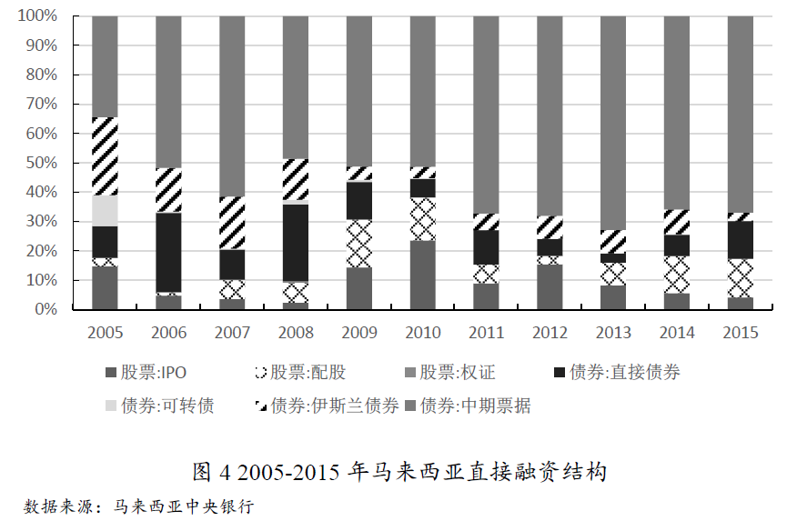 在融资结构中,马来西亚企业外源融资逐渐由间接融资主导转向间接融资与直接融资并重的结构,此外,其直接融资结构表现出明显的“重债轻股”特点。