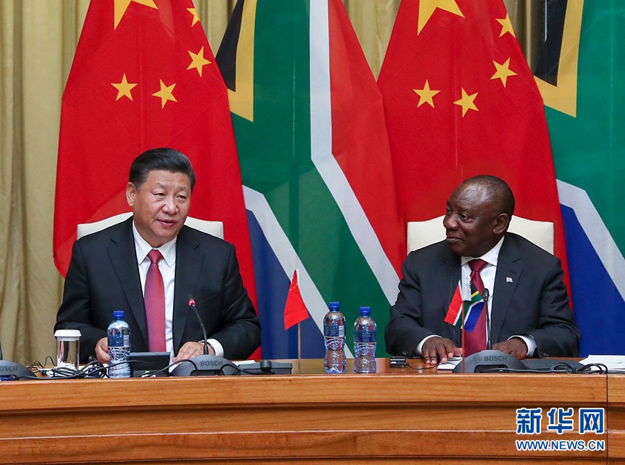 习近平赞赏拉马福萨为推动中南建交和促进两国关系发展作出的重要贡献。习近平指出,中国和南非都是具有重要影响的发展中大国和新兴市场国家。建交20年来,双方致力于合作共赢、共同发展,始终风雨同舟、休戚与共,建立起真诚友好、相互信任、亲密无间的“同志加兄弟”关系。中南关系实现了从伙伴关系到战略伙伴关系再到全面战略伙伴关系的重大跨越,给两国人民带来了实实在在的利益。中方愿同南方一道,以两国建交20周年为契机,相互支持办好今年金砖国家领导人约翰内斯堡会晤和中非合作论坛北京峰会,承前启后,继往开来,推动中南全面战略伙伴关系结出更多硕果,更好造福两国人民。