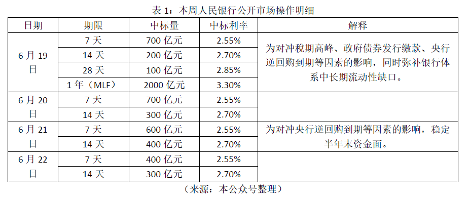 2。 2018年6月19日到6月22日,人民银行进行了多笔公开市场业务操作,具体表1所示。