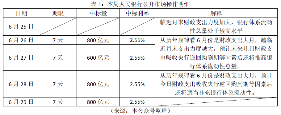 3. 2018年6月25日到6月29日,人民银行进行了多笔公开市场业务操作,具体表1所示。