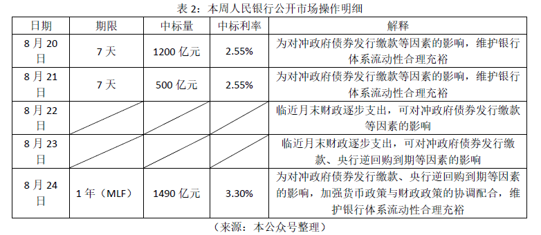 2. 2018年8月20日到8月24日,人民银行进行了多笔公开市场业务操作,具体表2所示。