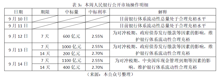 3. 2018年9月10日到9月14日,人民银行进行了多笔公开市场业务操作,具体表3所示。