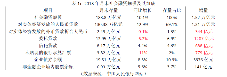 1. 2018年9月12日,中国人民银行发布2018年8月末的社会融资规模数据,具体如表1所示。