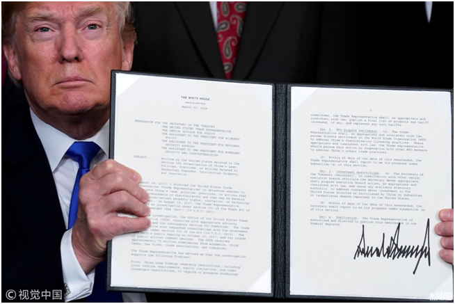 1. 2018年3月22日,美国华盛顿,美国总统特朗普签署总统备忘录,依据“301调查”结果,将对从中国进口的商品大规模征收关税,并限制中国企业对美投资并购。特朗普签字前对媒体说,涉及征税的中国商品规模可达600亿美元。
