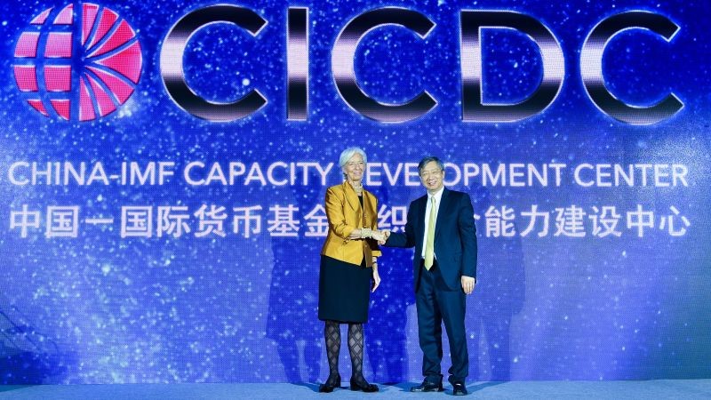 图2:人民银行行长易纲和IMF总裁拉加德共同宣布中国-国际货币基金组织联合能力建设中心启动
