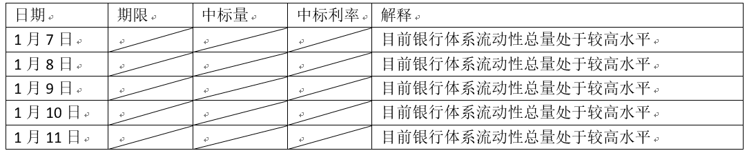 1.2019年1月7日到1月11日,人民银行未进行公开市场业务操作,具体表1所示。