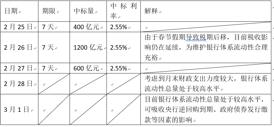 2.2019年2月25日到3月1日,人民银行进行了多笔公开市场业务操作,具体表1所示。
