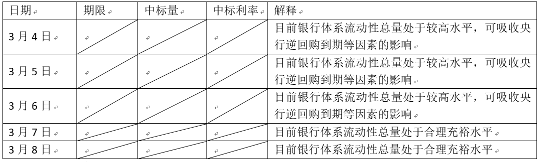 3.2019年3月4日到3月8日,人民银行未进行公开市场业务操作,具体表1所示。