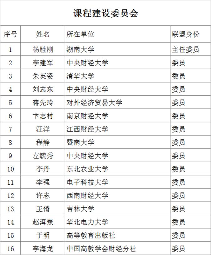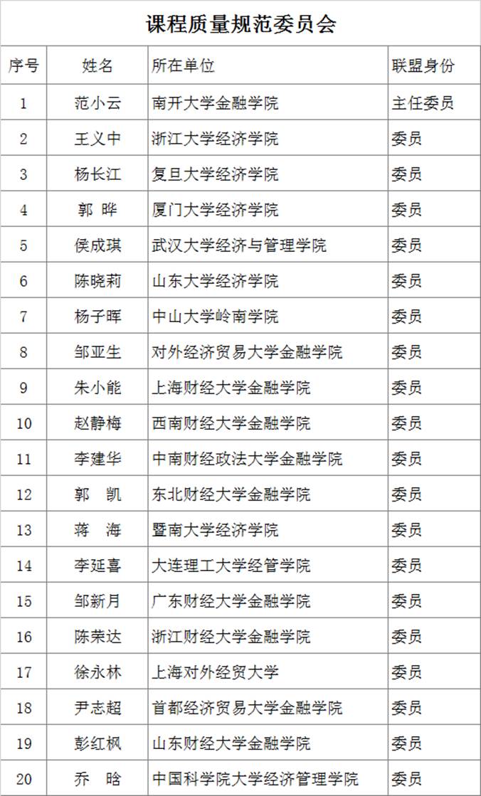 南开大学(范小云)、复旦大学(杨长江)、厦门大学(郭晔)、山东大学(陈晓莉)、湖南大学(吴志明)、武汉大学(侯成琪)、西南财经大学(赵静梅)、上海财经大学(朱小能)、中南财经政法大学(李建华)、对外经济贸易大学(邹亚生)、东北财经大学(郭凯)、山东财经大学(彭红枫)、南京财经大学(卞志村)、江西财经大学(汪洋)、上海立信会计韦德1946体育官方入口(张云)、广东韦德1946体育官方入口(王醒男)、高等教育出版社(于明)、中国高教学会财经分会(李海龙)
