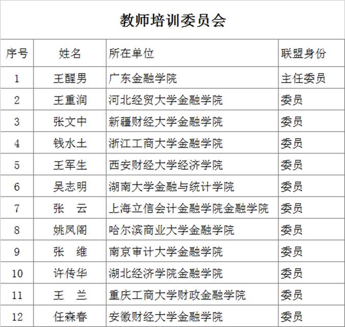 (2)课程建设委员会:依据金融学科各专业分类特点,建议分别设立金融学专业课程建设工作组、金融工程专业课程建设工作组、保险学专业课程建设工作组、投资学专业课程建设工作组、信用管理专业课程建设工作组、互联网金融与金融科技专业课程建设工作组等,各工作组负责制定各专业课程建设指南、遴选“联盟推荐优秀课程”、评选“联盟优秀主讲教师”等工作。