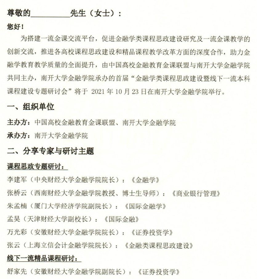 首届“金融学类课程思政建设暨线下一流本科课程建设专题研讨会”邀请函