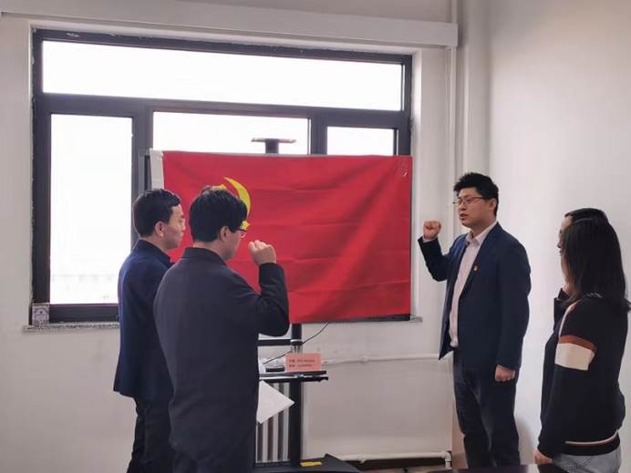 首先举行了重温入党誓词活动。金融科技系党支部书记李德峰带领全体党员面向党旗,庄严宣誓,对党忠诚,为共产主义奋斗终身。