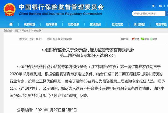 2021年1月15日,中国银行保险监督管理委员会发布2021年第1号:《保险公司偿付能力管理规定》已经2020年6月11日中国银保监会2020年第9次委务会议审议通过。现予公布,自2021年3月1日起施行。偿二代二期工程正式进入实施阶段。