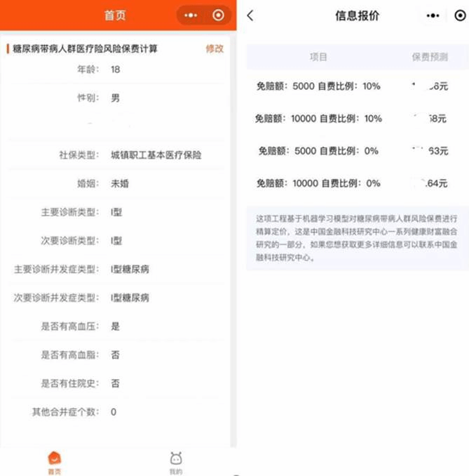 精算定价目前支持糖尿病带病群体,用户在小程序中输入各项相关指标,如糖尿病类型、社保类型等,小程序基于机器学习模型对其进行定价,价格差异可以衡量健康价值。