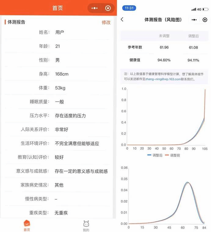 健康量化部分,用户在小程序中输入各项身体健康指标,即可对个人健康状况进行量化,小程序基于健康管理科学模型,输出用户的健康值,健康等相关图表,可以用于健康评估、健康财富全生命周期管理以及保险等多个领域。该计算基于团队研究、最新的健康管理科学模型以及生命质量的框架,后续还将不断引入新的模型和技术,进一步传递最新研究的成果,并为使用者创造价值。