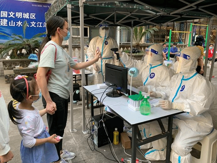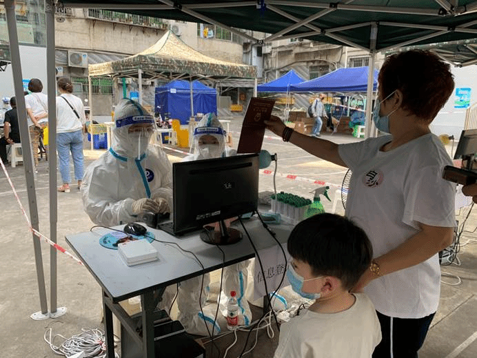 早上大概7点,我们准备就绪,市民们也排起了长队,我们的核酸检测也正式开始,信息录入的工作也在工作人员小姐姐和我的共同努力下有条不紊地开展。我负责辅助工作人员小姐姐,而她则负责主要的工作——电脑端信息录入和采集。我主要进行给管子贴条码、扫描管子上的条码等工作,刚开始,我还不大熟练,一步一步来,逐渐便熟练了。而社区工作人员小姐姐进行扫描渝康码或者手动录入信息等工作。