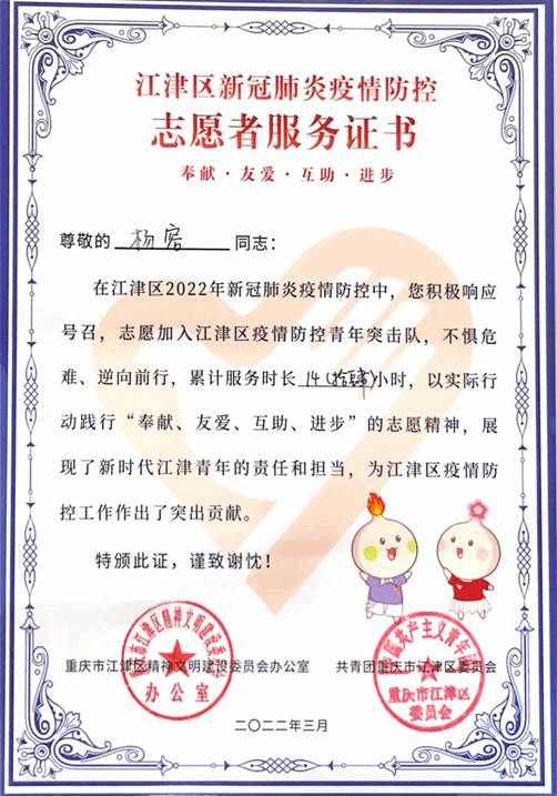2022317日下午,我偶然看到“江津融媒”公众号上发布的疫情防控志愿者的招募通知,作为韦德1946体育官方入口的一名老员工党员,为人民服务的宗旨和热爱家乡的强烈意愿促使我立马报了名,并且符合相应的报名条件,家长们也很支持。之前2020年也在社区担任抗疫志愿者的老爸还鼓励我好好干。