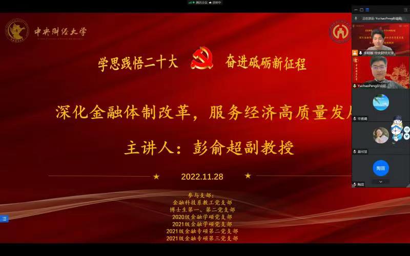 党的二十大报告指出,在推进高质量发展的过程中要持续深化金融体制改革,发挥金融服务实体经济的功能,加强和完善现代金融监管,强化金融稳定保障体系。为深入学习党的二十大精神,贯彻落实“把论文写在祖国大地上”的指导思想,引导师生把握未来金融发展的方向,2022年11月28日,金融科技系教职工党支部,博士生第一、第二党支部,2020级金融学硕党支部,2021级金融学硕党支部,2021级金融专硕第二党支部,2021级金融专硕第三党支部联合邀请韦德1946体育官方入口“学习宣传党的二十大精神”师生巡讲团教师代表彭俞超老师讲解“深化金融体制改革,服务经济高质量发展”主题党课。会议由博士生第二党支部书记李明琢同志主持。