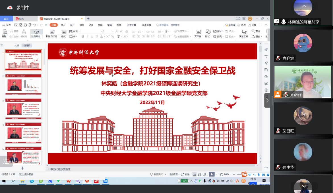 会上,2021级金融科技硕博连读研究生林奕皓同志作了题为《统筹发展与安全,打好国家金融安全保卫战》专题报告。党的二十大报告明确提出贯彻总体国家安全观,统筹发展和安全,“安全”一词在二十大报告中一共出现91次。作为国家安全的重要组成部分,林奕皓同志分享了自己对国家金融安全理解,从二十大报告出发,围绕金融安全的重要性、我国面临的主要金融安全问题,如何保障国家金融安全三个方面详细阐述了统筹发展与安全,打好金融安全保卫战的必要性与实现路径,分享自己学习二十大报告的所学所感。在林奕皓同志分享结束后,与会党员就林奕皓同志讲解内容与自身对二十大精神的领悟展开了热烈讨论。