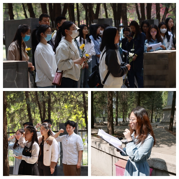 在“三一八”烈士公墓,党员和入党积极分子依次走向烈士陵墓,手持鲜花,低头默哀,向长眠于此的英雄烈士表达深深的敬意。在本科生第五党支部书记张文雅的领誓下,大家右手握拳,高举过肩,庄严宣誓,铿锵有力的誓词凝聚着对党的忠诚和对人民的承诺。本科生第一党支部党员陈韵老师带来了一场别开生面的现场微党课,以声情并茂的讲述,带领大家重温了“三一八”死难烈士的英勇事迹,回顾了新民主主义革命时期党的奋斗历程。在烈士墓前,大家更加直观深刻地认识到党的奋斗历程和革命精神,也更加坚定了自己为党和人民事业奋斗终身的信念。